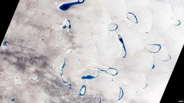 | O tempo mais quente derretendo neve e gelo na Groenlância, provocando depressões na superfície glacial e exibindo os pontos em tom de azul. | Foto: NASA |
